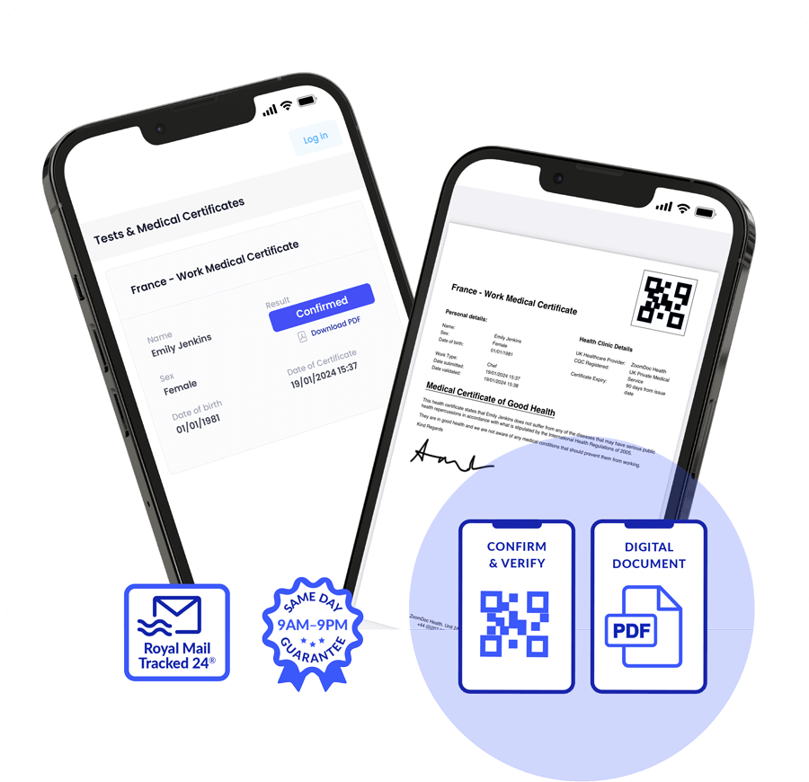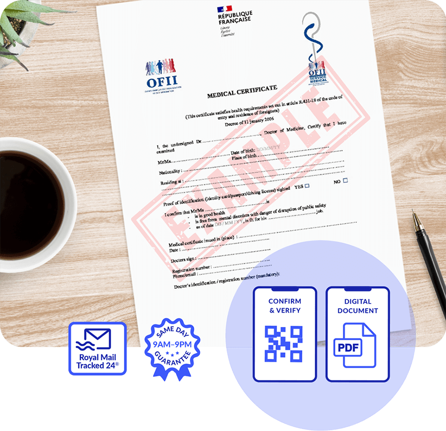 Your signed original certificate and additional Office Francaise De L’Immigration Et De L’Intgeration Medical Certificate will be sent same-day via Royal Mail Tracked 24