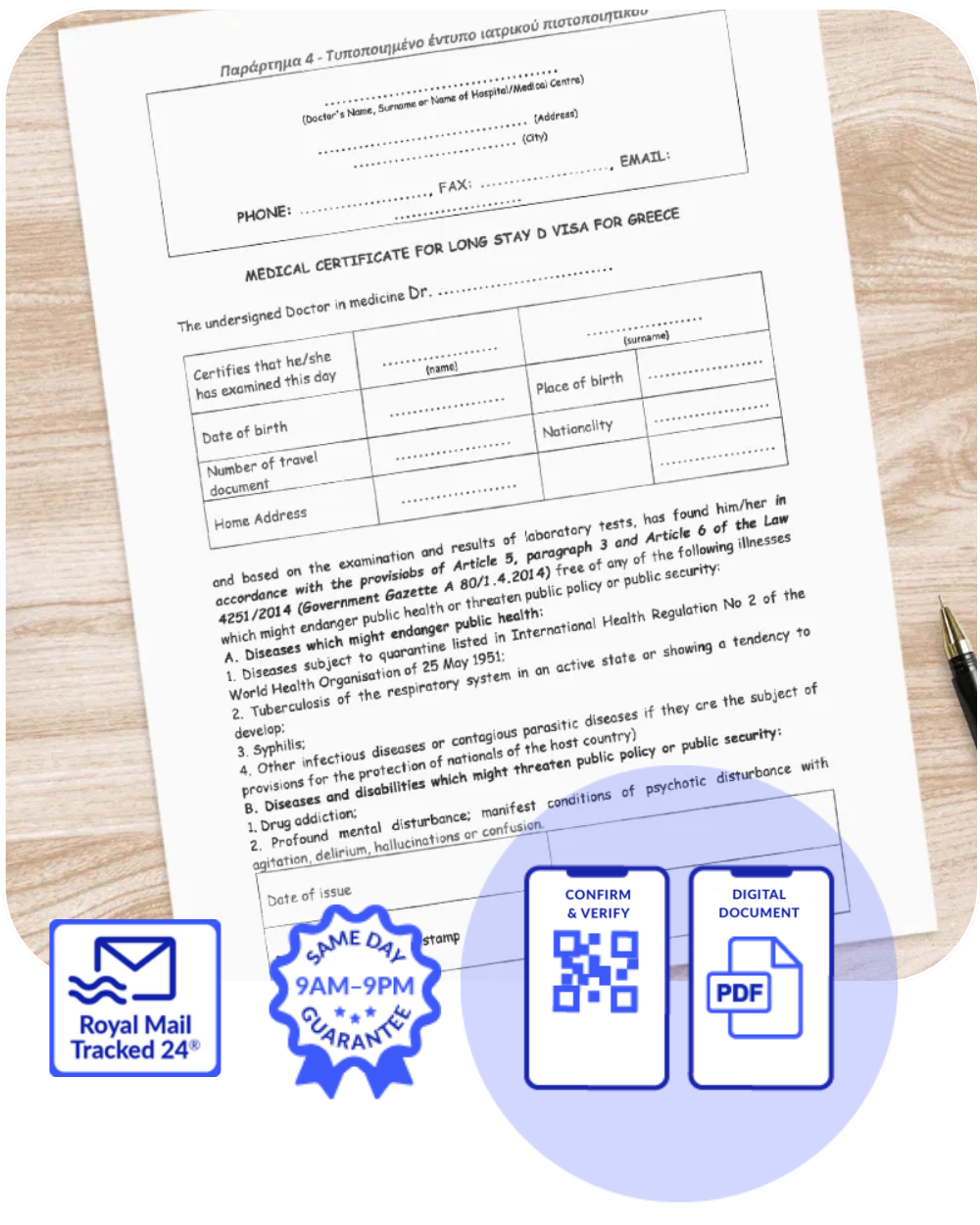 Your signed original certificate and additional Greece Medical Certificatewill be sent same-day via Royal Mail Tracked 24