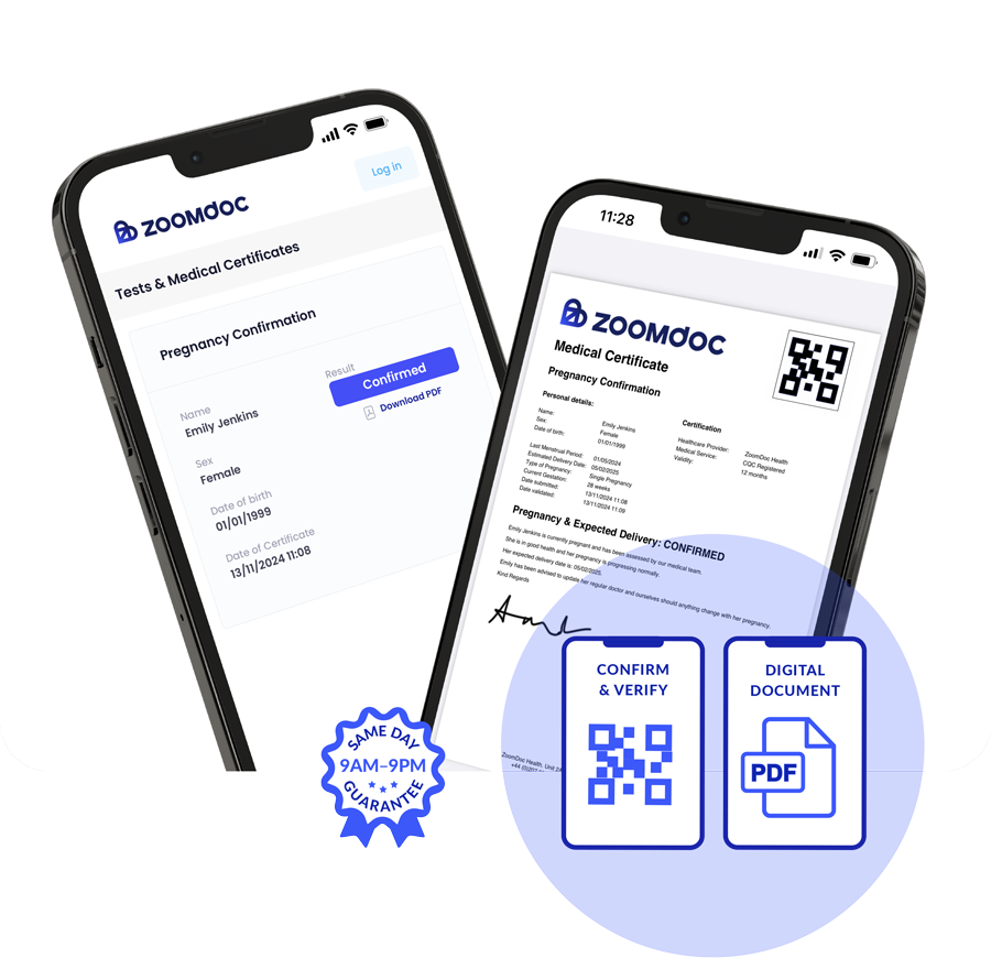 You will receive a verifiable digital PDF certificate signed by a UK Doctor and sent directly to your mobile, containing the following details: